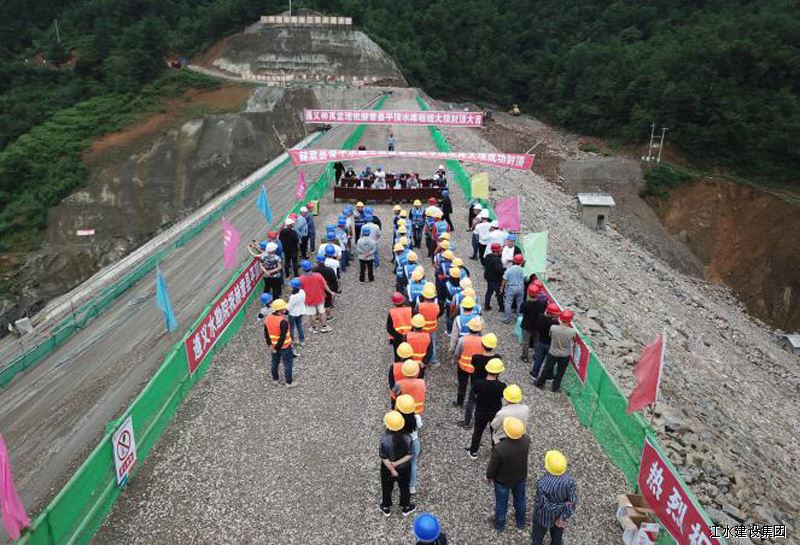 該工程是一座混凝土面板堆石壩,壩高47m,大壩填筑工程量42萬(wàn)m3,大壩于2021年3月5日開(kāi)始填筑,2021年6月30日填筑完成。大壩填筑完成后,得到了建設(shè)單位、監(jiān)理單位及總包單位的祝賀與肯定。該工程屬貴州省“鄉(xiāng)鄉(xiāng)有穩(wěn)定水源”項(xiàng)目,年供水量250.8萬(wàn)m3,建成后可為安樂(lè)溪鄉(xiāng)集鎮(zhèn)及農(nóng)村20000余人提供安全穩(wěn)定供水和21670畝農(nóng)田灌溉用水以及將極大緩解當(dāng)?shù)厝彼桶踩嬎畣?wèn)題,意義重大。施工項(xiàng)目部將繼續(xù)堅(jiān)持“科學(xué)管理、精心組織”理念,嚴(yán)格按設(shè)計(jì)和規(guī)范要求,在確保安全和質(zhì)量的前提下加快施工進(jìn)度,為安樂(lè)溪人民盡早提供安全水、干凈水及改善供水目標(biāo),確保在合同工期以內(nèi)按時(shí)、按質(zhì)、按量盡早建成交付建設(shè)單位投入使用。集團(tuán)副總裁胡鴻煌參加大壩封頂儀式。