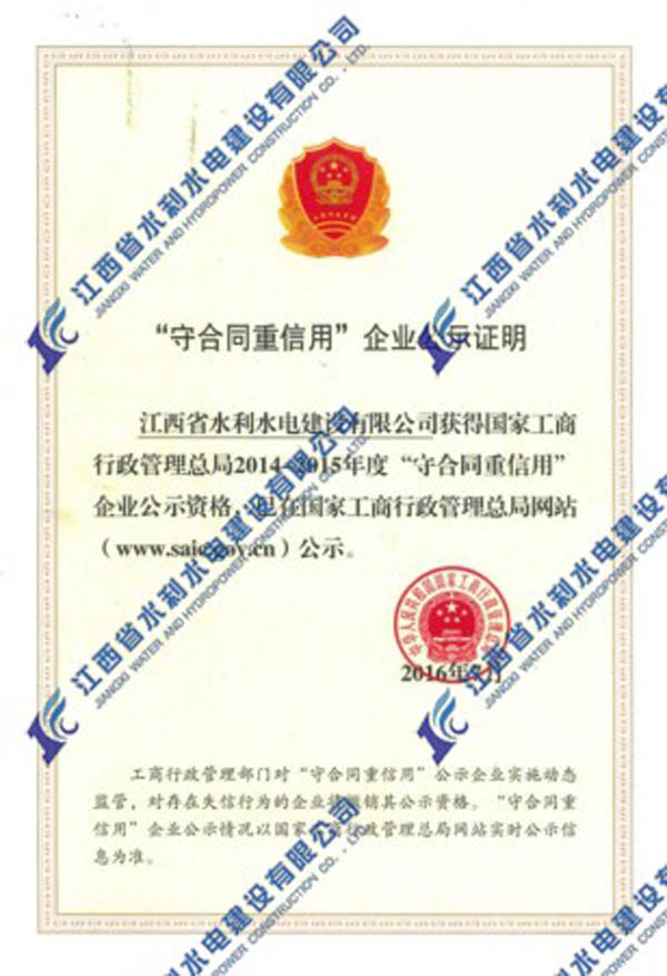 2016年我公司首次榮獲國家工商行政管理總局2014-2015年度“守合同重信用”企業(yè)公示資格?!笆睾贤匦庞谩惫净顒?,是工商部門依托合同行政監(jiān)管職能組織開展的旨在推進企業(yè)信用建設的“守重”企業(yè)公示活動,是長期以來我國社會信用體系建設的重要組成部分。
