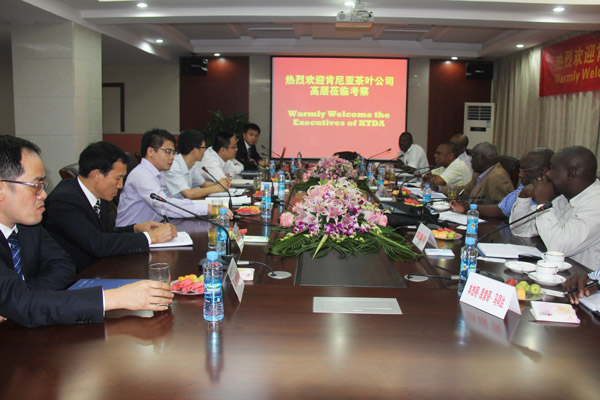 2014年9月上旬,肯尼亞茶葉發(fā)展有限公司董事Philip Kibirech NG’Etich先生一行七人應邀來我公司參觀考察,旨在加深雙方了解和建立互惠共贏的合作??偨?jīng)理徐洪良代表公司對他們的到來表示熱烈歡迎,總會計師王義生、總工程師胡鴻煌及海外公司相關負責人參加了會見并陪同肯尼亞客人參觀了公司總部各部門。