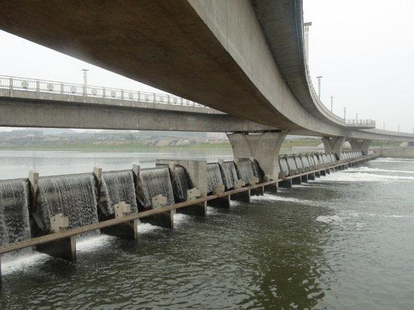 三級(jí)抬水壩與人行景觀橋下游面全景