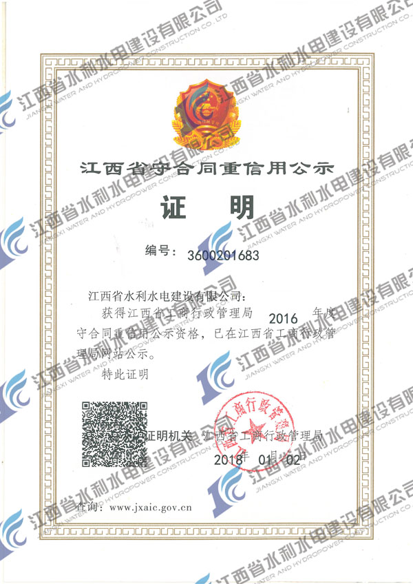 近日,公司獲評(píng)2016年度江西省守合同重信用公示資格。