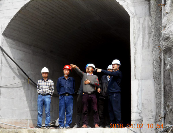 董事長(zhǎng)在導(dǎo)流洞出口聽(tīng)取項(xiàng)目經(jīng)理匯報(bào)工程進(jìn)展情況