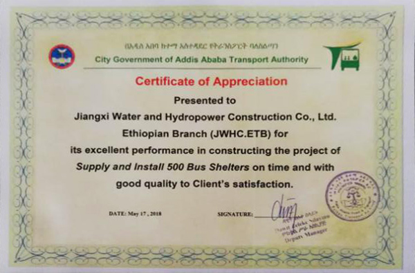 近日,埃塞有限公司收到亞的斯亞貝巴市交通局頒發(fā)的感謝證書(shū),表彰公司在承建亞的斯亞貝巴市500套公交候車亭供貨與安裝項(xiàng)目上表現(xiàn)優(yōu)異。