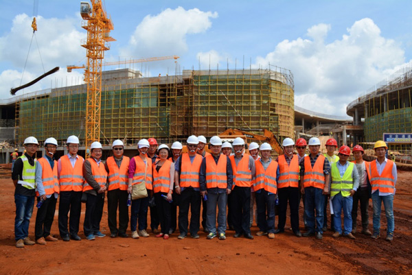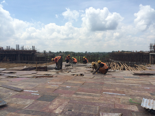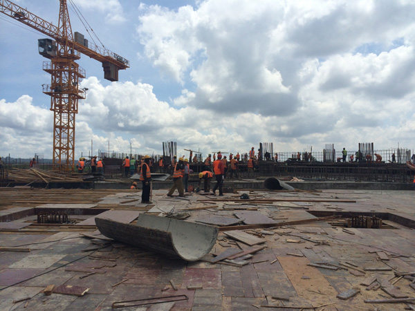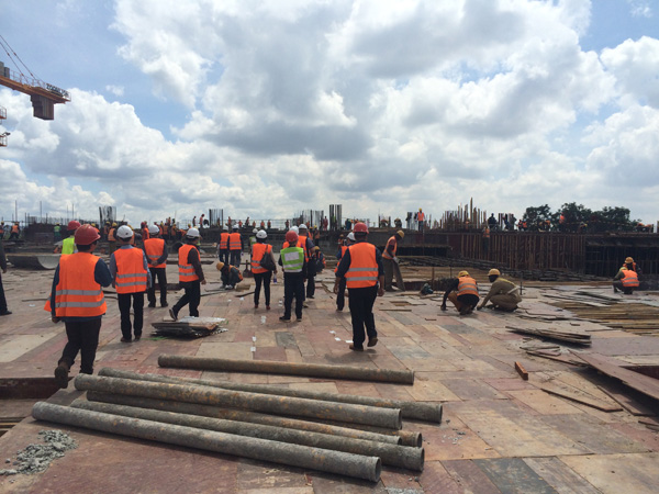 “雙河”項目是一個集零售商場、現(xiàn)代辦公樓、公共娛樂以及配套設(shè)施的綜合性工程,作為東非最大的在建城市綜合體,總建筑面積為18.2萬平方米,單層面積就超過四萬多平米。雖然出國前我對“雙河”項目就有一定的了解,但親臨現(xiàn)場,感受工地的壯觀,內(nèi)心仍然受到巨大的震撼。這個項目涉及到的工程類別較多,施工統(tǒng)籌及安全質(zhì)量監(jiān)控難度較大。在施工現(xiàn)場,我們看到各作業(yè)工種工作安排得井井有條,各類安全標(biāo)識及安全設(shè)施科學(xué)規(guī)范,雖然現(xiàn)場施工作業(yè)人數(shù)超過1000多人,但讓人感覺既熱火朝天,又忙而不亂有條不紊地進(jìn)行著。