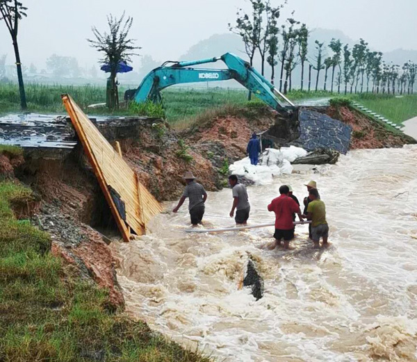 暴雨肆虐,洪災(zāi)無情。7月8日,雨勢加大,險(xiǎn)情加重,出現(xiàn)漫堤、農(nóng)田被淹等險(xiǎn)情,國家財(cái)產(chǎn)和人民群眾的生命安全正面臨嚴(yán)重威脅,危難當(dāng)前彰顯擔(dān)當(dāng),公司副總經(jīng)理曾朝文、總經(jīng)理助理杜凌冒雨在抗洪前線親自指揮,不顧個人安危,哪里有險(xiǎn)情就奮戰(zhàn)到哪里,經(jīng)過公司救援隊(duì)伍連續(xù)10余小時(shí)的奮勇?lián)寫?zhàn),險(xiǎn)情得到基本控制,確保了農(nóng)田和橋梁安全。