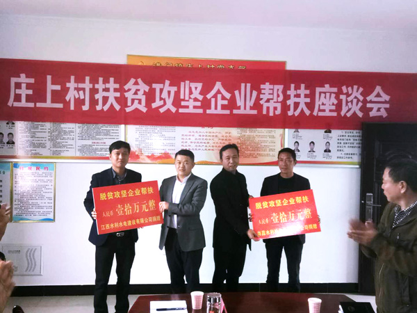 為認(rèn)真貫徹落實(shí)黨的十九大關(guān)于堅決打贏脫貧攻堅戰(zhàn)的新部署新要求,踐行企業(yè)的社會責(zé)任。11月17日,公司副總經(jīng)理王俊華同志率撫州廖坊灌區(qū)二期工程施工總部負(fù)責(zé)人胡福民、項目財務(wù)部負(fù)責(zé)人肖志兵代表江西省水利水電建設(shè)有限公司前往南城縣洪門鎮(zhèn)參加莊上村扶貧攻堅企業(yè)幫扶座談會,并將公司捐助的10萬元扶貧資金送至莊上村村委會。