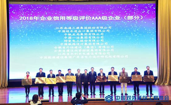 集團(tuán)資訊12月5日,中國對外承包工程商會第七屆理事會第四次全體會議在山東濟(jì)南隆重召開,來自全國各地的140多家理事單位的300多名代表參加會議。公司董事、海外公司執(zhí)行董事張周平出席會議。會議頒發(fā)了“2018年企業(yè)信用等級評價AAA級企業(yè)(部分)”牌匾,公司憑借良好的業(yè)績和口碑,再次榮獲中國對外承包工程企業(yè)信用評價AAA級信用企業(yè),并在現(xiàn)場受邀上臺接受授牌。