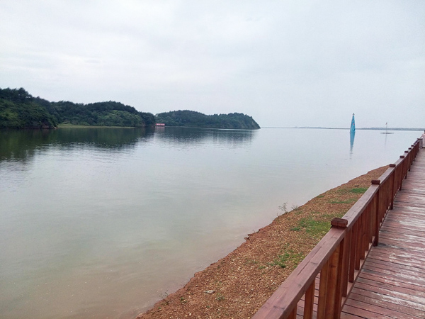走過一段緩長的混凝土臺階,映入眼簾的是一片寬闊無垠的湖面,天青色的水面被微風(fēng)揉出一段段波紋,宛如一匹極其細(xì)膩柔軟的綢緞。湖面點綴的,除了長滿了藏青色樹木小島外,還有一艘艘或藍(lán)白或紫紅涂裝的游艇,在碧波之上劃出一道道雪白的弧線。一艘紅柱黃瓦的游舫緩緩駛離臨時的游客碼頭,幾只野鴨伴隨著游舫歡快嬉戲。